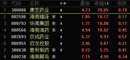 除海南海药外,海南瑞泽走出6天3板,康芝药业收获20CM涨停,华闻集团、双成药业等个股也实现10CM涨停。