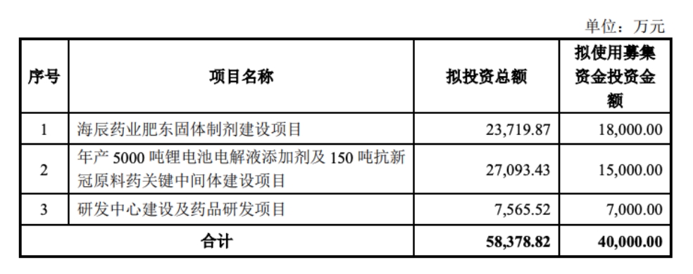 转眼来到2022年中旬,海辰药业公告,拟向特定对象发行股票募集资金总额不超过4亿元,用于海辰药业肥东固体制剂建设项目、年产5000吨锂电池电解液添加剂及150吨抗新冠原料药关键中间体建设项目和研发中心建设及药品研发项目。