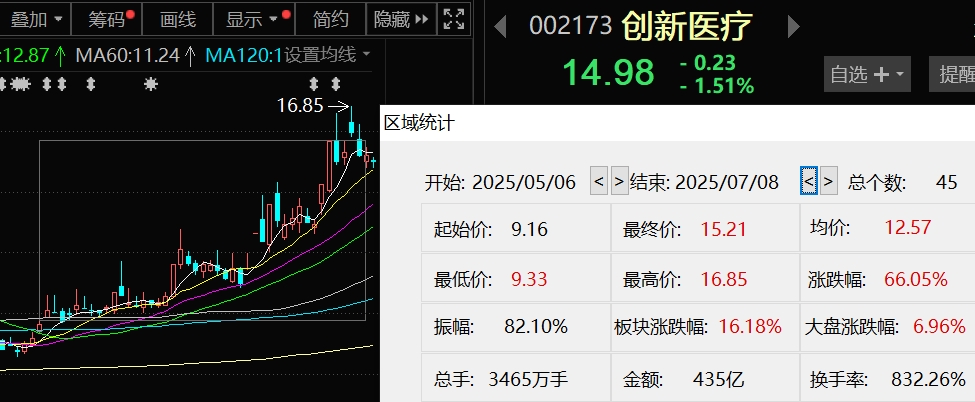 行情显示,5月6日至7月8日,创新医疗股价累计涨幅为66.05%,换手率达832.26%,股价从9.16元/股上涨至15.21元/股。
