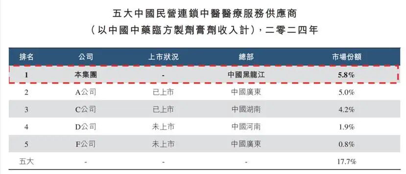 据誉研堂招股书数据,在“中药临方制剂膏剂”这一细分领域,誉研堂市场份额占比5.8%,稳坐中国民营连锁中医医疗服务供应商的头把交椅。