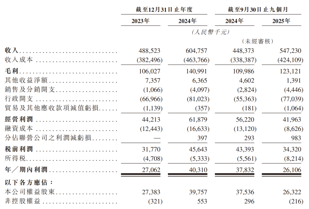 盈利水平方面,2023年全年期内利润为2706.2万元,2024年全年增长至4031万元,同比增长约48.9%,增速高于收入增速。2025年前九个月期内利润为2610.6万元。