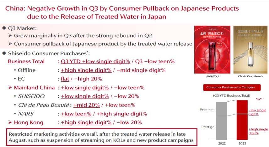 资生堂集团方面在财报中也表示,虽然上半年资生堂和肌肤之钥的实力带来强劲增长,但这部分被日本排放核污水消费者减少购买日本产品的不利影响所抵消,导致第三季度净销售额下降,电子商务的净销售额受到的影响最为明显。