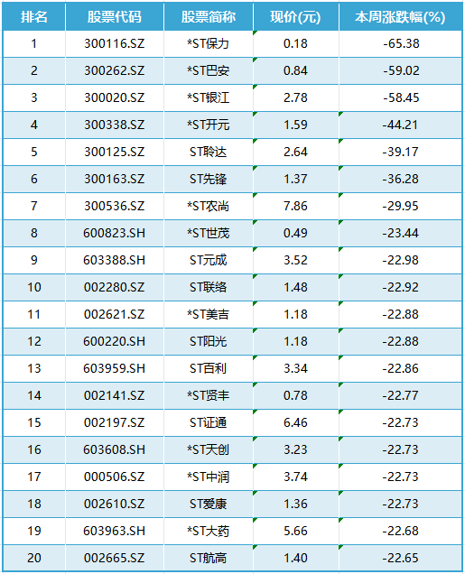 本周排在跌幅榜前十名的分别是*ST保力、*ST巴安、*ST银江、*ST开元、ST聆达、ST先锋、*ST农尚、*ST世茂、ST元成、ST联络。
