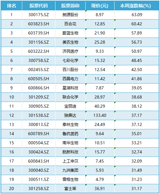 iFinD数据显示,本周排在上市公司涨幅榜前十名的分别是朗源股份、百合花、蔚蓝生物、美农生物、济民医疗、七彩化学、百川股份、西昌电力、星湖科技、联合化学。