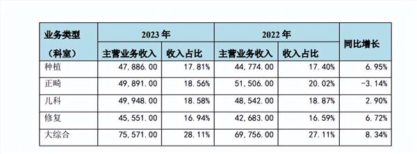 不可否认的是,相关举措带动种植量提升。2023年,通策医疗种植量达5.3万多颗,同比增长47%。不过,从主营业务收入构成来看,去年种植收入为4.79亿元,在数量大幅提升的同时,收入仅同比增长6.95%。