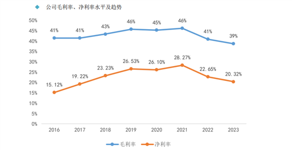 2023年,通策医疗的毛利率、净利率为39%和20.32%,均创下近五年来阶段性新低。