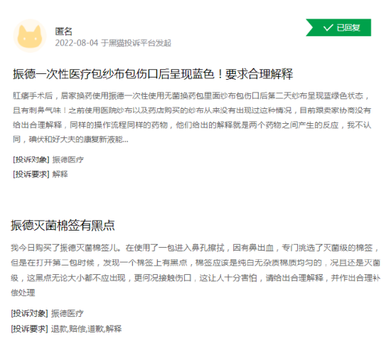 览富财经网注意到,振德医疗此前曾因产品质量问题被消费者投诉。
