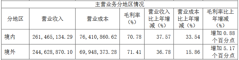 2023年年报显示,安杰思境外业务营收达到2.45亿元,同比增长36.78%;毛利率高达71.41%,相比上年增加了5.17个百分点。从数据可看出,该公司的境外业务拓展效果良好。