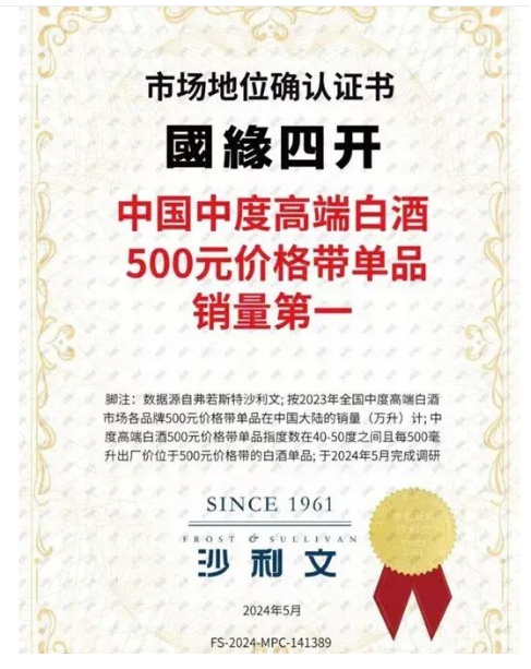 根据相关报道,经咨询机构弗若斯特沙利文认证,国缘四开获得“中国中度高端白酒500元价格带单品销量第一”,该调研于2024年5月完成。