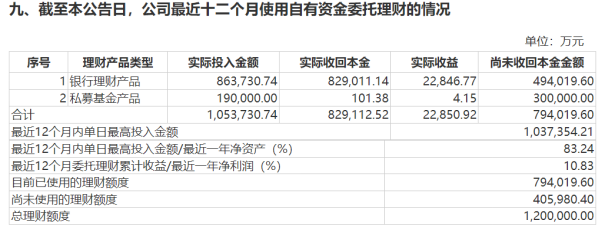 证券之星查找发现,前述交易性金融产品主要为公司购买的理财产品,公司自上市后也发布过大量关于使用闲置自有资金进行现金管理的进展公告,其理财产品种类涵盖银行理财产品、私募基金产品、金融债券产品等。而在收益率方面,养元饮品在2022年5月13日发布的公告中称,其最近一年投入理财产品金额合计105.3亿元,实际收益合计2.285亿元。以此计算的收益率约为2.17%。