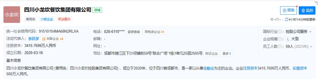 2020年3月,小龙坎集团正式成立。天眼查信息显示,其法人为李硕彦,实际控制人为吴东。经营范围包括餐饮服务、食品销售、酒类经营等。