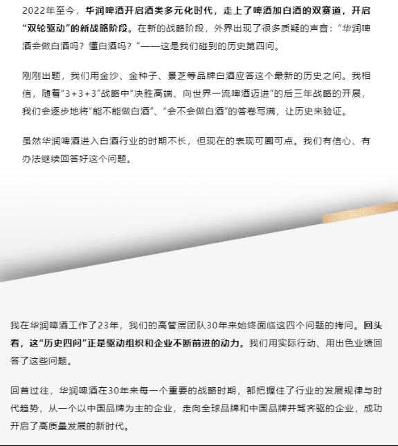 “2022年至今,华润啤酒开启酒类多元化时代,走上了啤酒加白酒的双赛道,开启‘双轮驱动’的新战略阶段。在新的战略阶段,外界出现了很多质疑的声音:“华润啤酒会做白酒吗?懂白酒吗?”——这是我们碰到的历史第四问。
