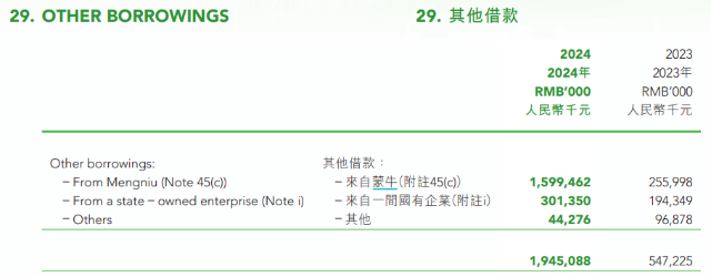 此外,截至2024年末,现代牧业的资产负债率已攀升至67.23%,其中集团的流动负债比流动资产多出5.51亿元,存在短期偿债压力。为帮助现代牧业缓解资金紧张问题,截至2024年末,公司从蒙牛集团获得的其他借款达15.99亿元,而2023年末这一借款金额仅为2.56亿元,增幅显著。