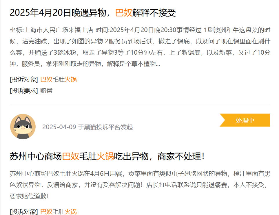 尽管在企业规模上巴奴取得不错成绩,但在产品服务和口碑上似乎没有跟上节奏,有消费者称,产品质量及数量上相较于以往都有所变化。在黑猫投诉上也有巴奴的不少投诉问题。
