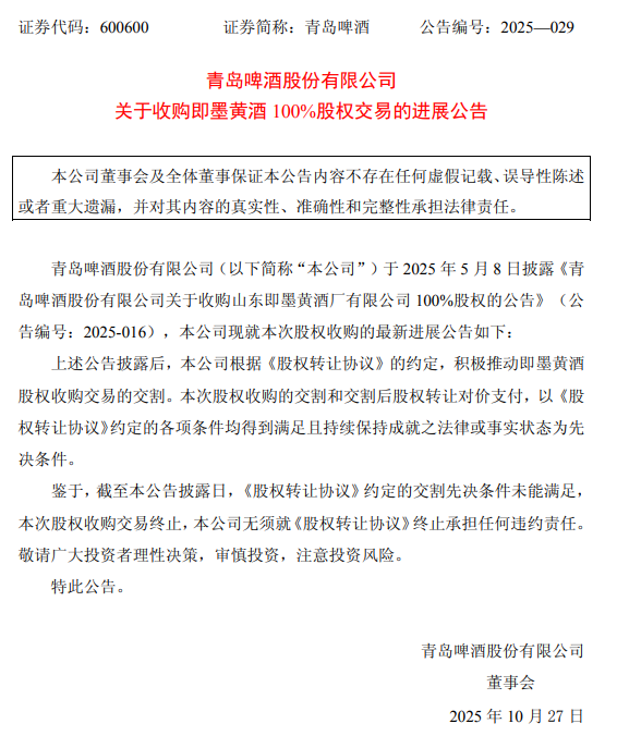 青岛啤酒发布公告,此前公司披露拟收购山东即墨黄酒厂有限公司(简称“即墨黄酒”)100%股权,截至公告披露日,《股权转让协议》约定的交割先决条件未能满足,本次股权收购交易终止。