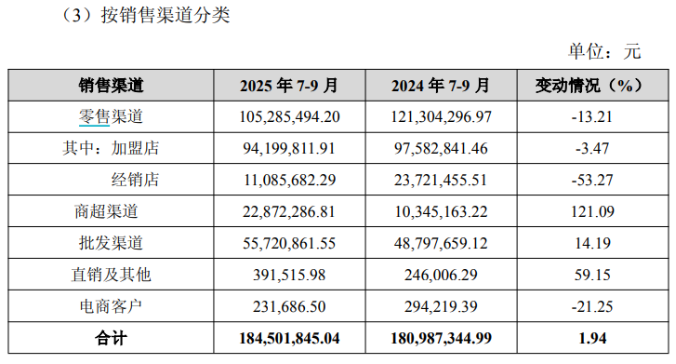 不过从第三季度表现看,零售渠道的承压状态并未得到改善,期内加盟店经销商数量净减少16家,来自加盟店的收入同比下滑3.47%至9419.98万元,期末加盟店数量进一步收缩至1685家。相比之下,第三季度经销店的经销商数量回暖,期内净增加11家,收入表现却呈现疲态,来自经销店的收入同比大幅下滑53.27%至1108.57万元。