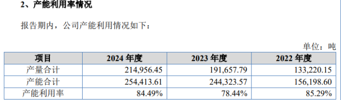 招股书显示,扩建项目拟投入募集资金2.78亿元,该项目建成后可实现年产12吨的生产能力。然而,菊乐股份自身的产能利用率并未为此次扩产提供充分理由。其2022年至2024年的产能利用率分别为85.29%、78.44%和84.49%,尚未达到满负荷状态。这与同期冲刺北交所的贵州南方乳业形成鲜明对比——南方乳业因2024年产能利用率(低温产品99.76%,常温产品93.65%)已逼近极限而募资扩产。