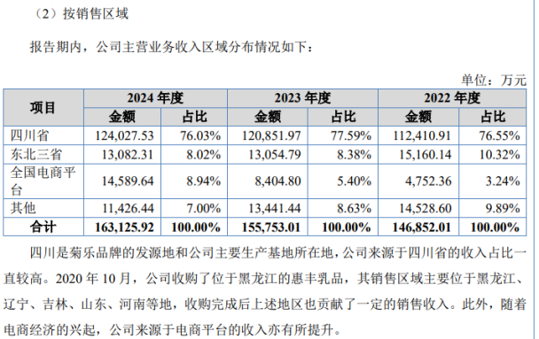 招股书显示,菊乐股份主营业务为含乳饮料及乳制品的研发、生产和销售。产品涵盖含乳饮料、发酵乳、巴氏杀菌乳及灭菌乳等,2022年至2024年,公司的营收规模分别达到14.72亿元、15.62亿元和16.41亿元。作为一家根植于四川省成都市的地方乳企,公司报告期(2022年至2024年)内的营收来源高度依赖省内,各期收入占比分别为 76.55%、77.59%和76.03%。