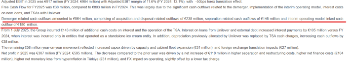 除了上述为分拆而支付的一次性重组成本外,梦龙在独立运营后的现金流层面还面临着另一重“刚性支出”的考验。财报显示,自2025年7月1日起,公司因两大事项新增了约1.43亿欧元的现金流出。其一是梦龙独立后为优化资本结构进行融资所产生的贷款利息;其二是根据与联合利华签订的过渡服务协议(TSA),以往仅作为会计处理的折旧费用,如今需要以现金形式向联合利华支付实际的服务对价。