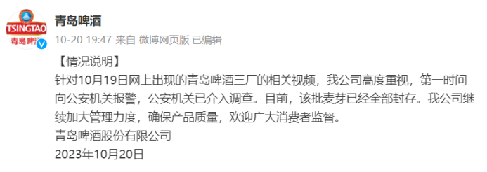 10月20日晚,青岛啤酒发布情况说明称,针对10月19日网上出现的青岛啤酒三厂的相关视频,我公司高度重视,第一时间向公安机关报警,公安机关已介入调查。目前,该批麦芽已经全部封存。我公司继续加大管理力度,确保产品质量,欢迎广大消费者监督。