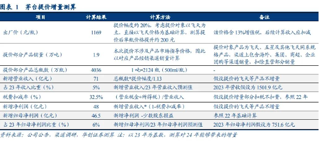 首先肯定是提价对利润的影响,由于机构对于茅台的业绩估算还是有较高准确度的,所以这里综合看下来,我们借鉴了华创证券的观点。