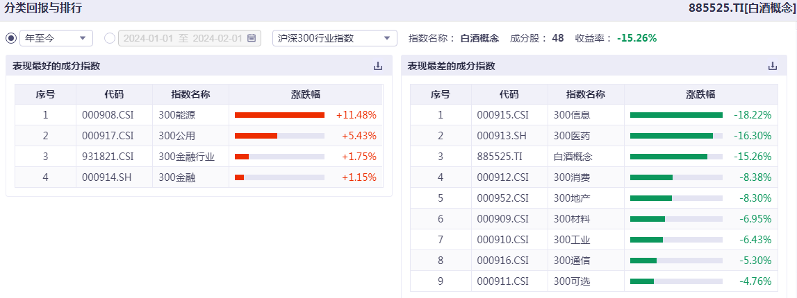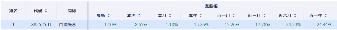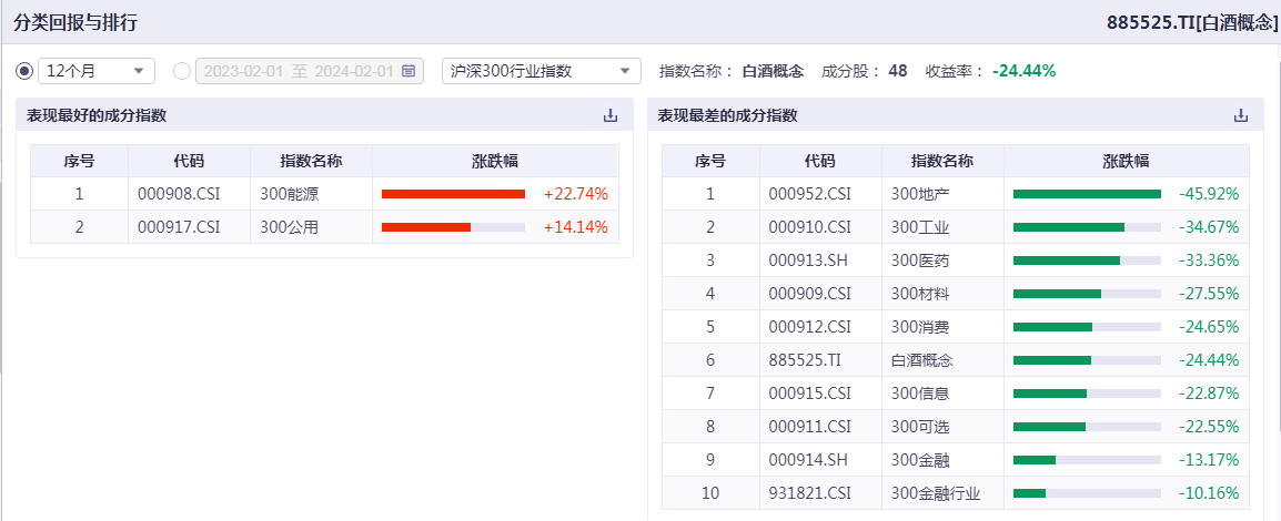 从指数分类回报与排行看,过去一年,在沪深300行业指数中,白酒概念指数位于跌幅榜第6位,收益率为-24.44%。