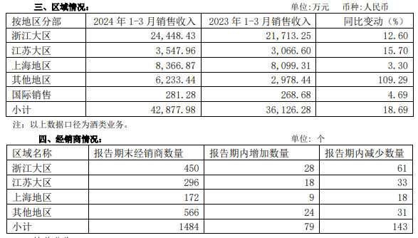 分地域来看,在传统江浙沪区域外,会稽山一季度在其他地区实现营收6233.44万元,同比增长109.29%。