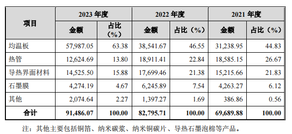 分产品看,除均温板金额和占比均大幅提升之外;热管、导热界面材料收入增速相对较慢,收入占比快速下降;石墨膜收入占比较低。