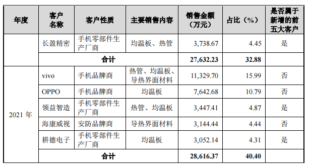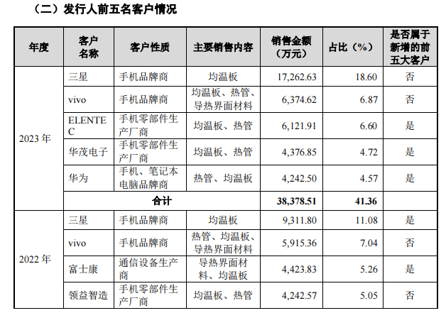 值得注意的是,苏州天脉前五大客户波动性较大,2020年,比亚迪为苏州天脉第二大客户;2021年,vivo、OPPO进入公司前五大客户;2023年,ELENTEC、华茂电子、华为取代富士康、领益智造、长盈精密进入公司前五大客户。
