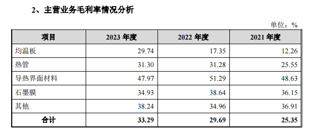2023年,苏州天脉主营业务毛利率为33.29%,较上一年度有所上升,主要是也是由于收入占比最高的均温板产品毛利率快速上涨所致。其他主营产品表现乏力。