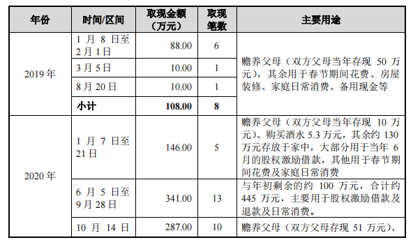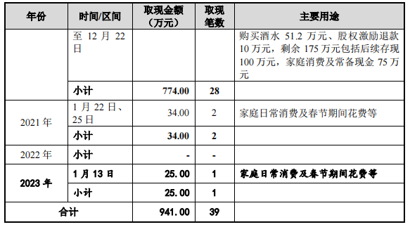 大额取现的主要用途包括:用于赡养父母、家庭消费及房屋装修等;用于调整股权激励价格后的退款、对部分员工的借款等。其中,“购买酒水”一项频繁出现。