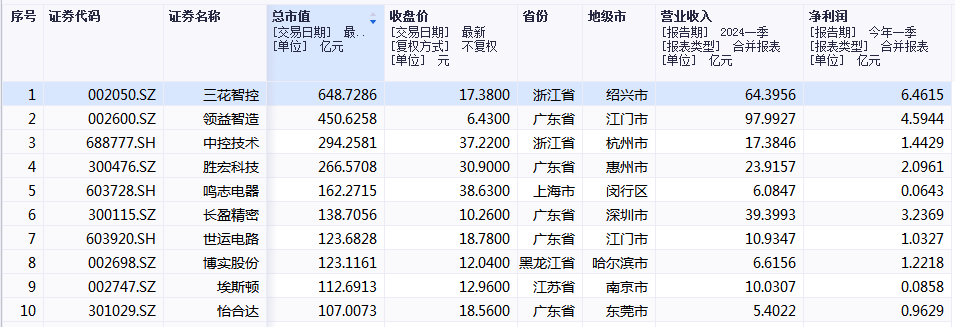 从总市值角度看,排名前十的分别是三花智控、领益智造、中控技术、胜宏科技、鸣志电器、长盈精密、世运电路、博实股份、埃斯顿、怡合达,总市值均超过百亿。