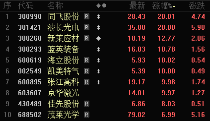 9月18日早盘,光刻机(胶)概念大涨,张江高科(600895.SH)、海立股份(600619.SH)等竞价涨停。截至中午收盘,波长光电收获20CM涨停,蓝英装备、京华激光等股也实现10CM涨停。