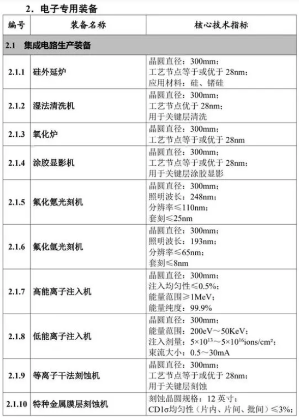 在《指导目录》中,“集成电路生产装备”板块列出了氟化氪光刻机和氟化氩光刻机。其中,氟化氩光刻机具有65纳米以下的分辨率和8纳米以下的套刻精度,能够支持28纳米工艺芯片的量产。这表明我国在半导体设备领域获得了重大突破。