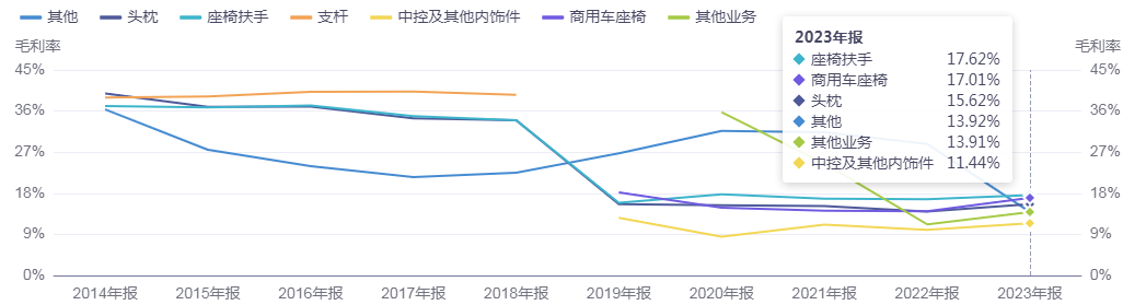 并购格拉默前,继峰股份毛利率保持在30%以上,净利率在14%以上。并表后,公司总体毛利率下降到13%-16%,净利润则在盈亏线上下浮动。