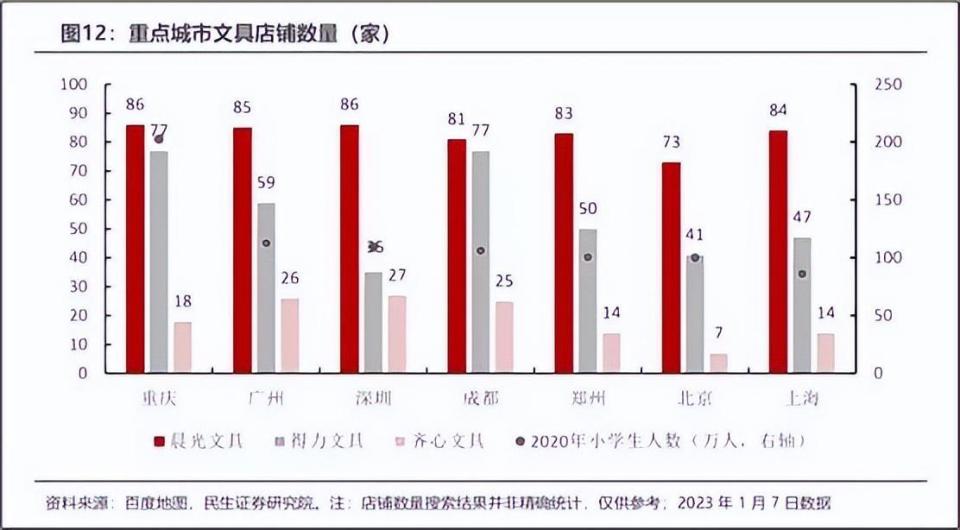 民生证券发布的研报显示,以全国小学生数量最多的7座城市为样本,统计文具店铺数量,晨光文具遥遥领先,其他友商望其项背,广博甚至榜上无名。