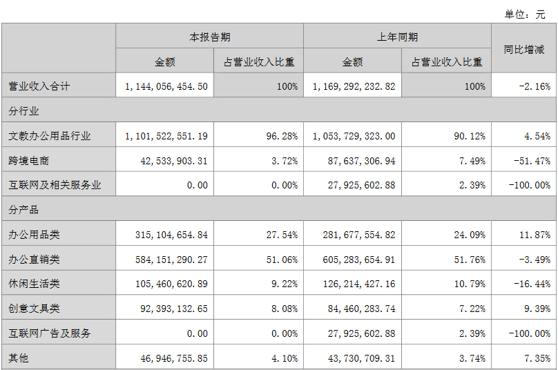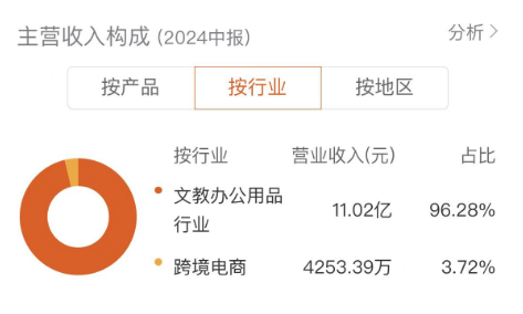 广博股份成立于1992年,后转型为综合文具供应商。2007年,广博股份登陆A股市场,正式成为国内第一家文具A股上市公司。截至2024年6月底,广博股份的文教办公用品行业收入11.02亿元,营收占比达到96.28%。