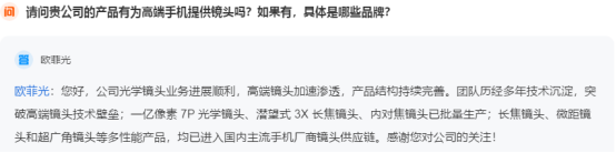 虽然对于是否参与了华为手机的摄像头,欧菲光并没有在近期公告中给出肯定的答案。但在互动平台回答投资者提问时,欧菲光表示,公司的长焦镜头、微距镜头和超广角镜头等多性能产品,均已进入国内主流手机厂商镜头供应链。