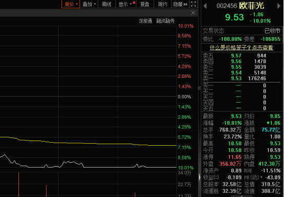 10月24日,欧菲光持续跳水,股价午后触及跌停。此后盘中虽然几度破板,但最终仍以跌停收盘。截至收盘,欧菲光卖一上仍有封单超17万手,成交额超75亿元。