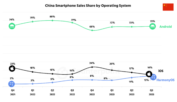 可喜的是,华为Harmony OS的市场份额呈现出良好的上升趋势。根据Counterpoint的统计,截至2023年第三季度,华为Harmony OS系统在中国的市场份额已经达到13%,是安卓、iOS之后的第三大手机操作系统,在全球市场的份额也达到3%。