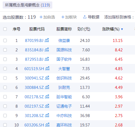 同花顺数据显示,截止1月15日收盘,鸿蒙概念股中涨幅前三的股票均来自北交所。而且在119只鸿蒙概念股中,它们是唯三的三只北交所股票。