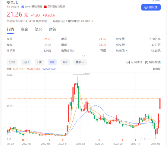 短期宣传自身“新冠病毒防治”的效果,对于股价有着强效的提升作用。安奈儿的股价在2022年底也一度由8元涨至29元,涨幅惊人。但长期来看,一家公司的股价终究还是由盈利水平决定的,遗憾的是,公司的盈利水平并不尽如人意。最终在今年年初,安奈儿股价掉落至7元每股,从哪里来的,回到了哪里去。