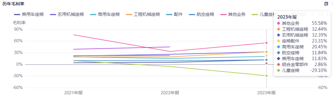 从利润端看,公司工程机械座椅业务毛利率处于较高水平达到32.44%。2023年,公司通过技术创新,实现产品升级,高端产品占比增加,整体毛利率水平达到19.10%,较上一年提升5.86个百分点。