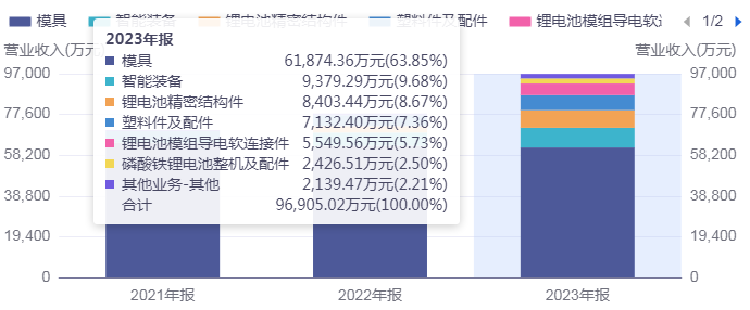 2023年,宁波方正实现营业收入9.69亿元,同比增长24.17%。主营业务中,模具收入6.19亿元,同比下降1.25%,占营业收入的63.85%;智能装备收入0.94亿元,同比增长47.82%,占营业收入的9.68%;锂电池精密结构件收入0.84亿元,同比增长175.85%,占营业收入的8.67%。