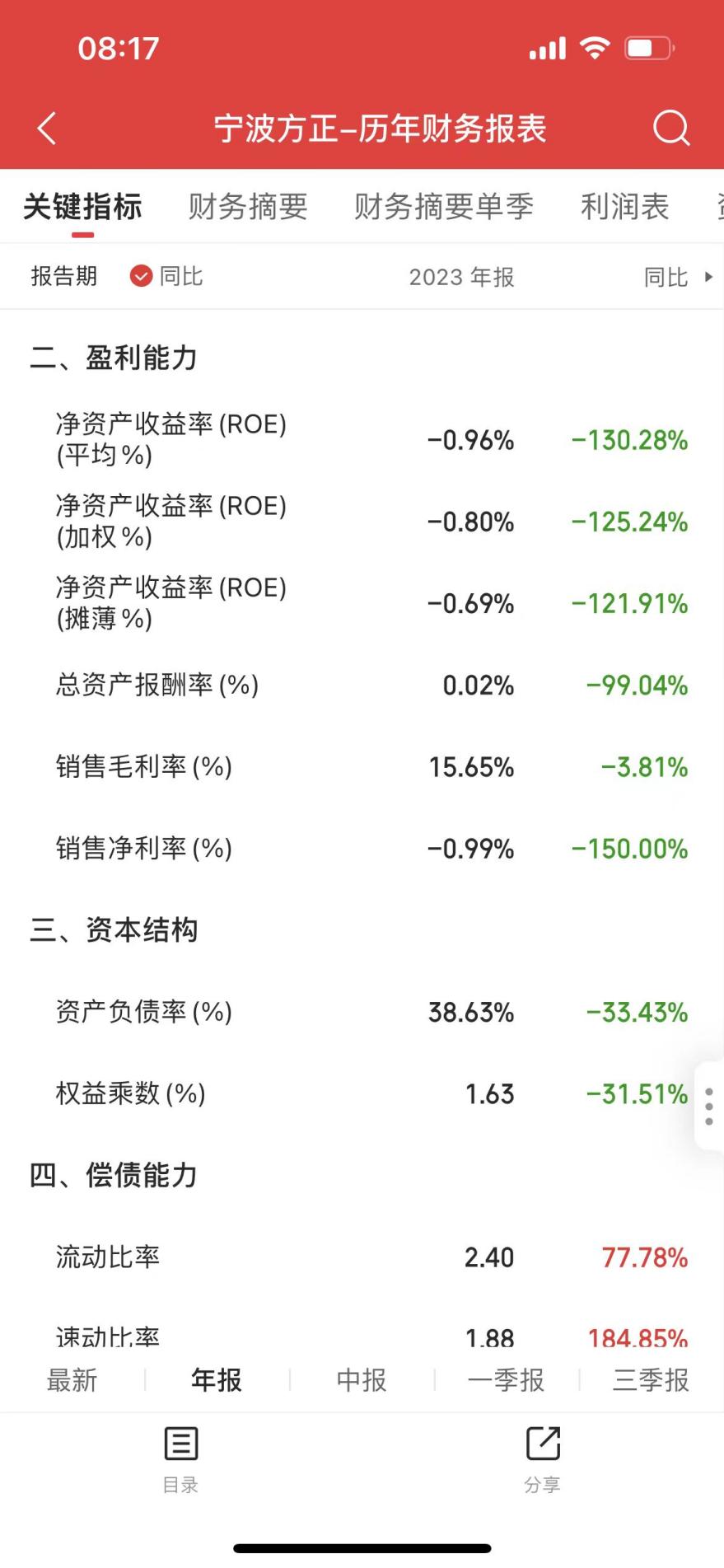 2023年,宁波方正实现归属于上市公司股东的净利润为-907.42万元,同比下降151.42%,其中,实现归属于上市公司股东的扣除非经常性损益后的净利润为-2041.96万元,同比下降 328.08%。