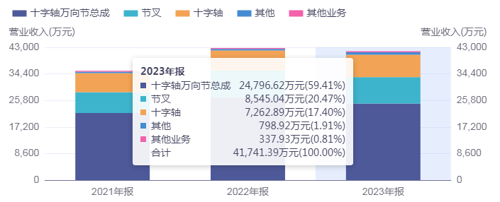 2023年,正强股份实现营业总收入4.17亿元,同比下降2.43%;净利润9691.89万元,同比下降1.15%。分产品看,十字轴万向节总成收入占比近60%,节叉收入占比近20%,十字轴收入占比近17%。