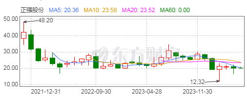 2021年,正强股份在深交所创业板块上市,发行价17.88元,开盘价49.89元,上涨179%。然而,上市即巅峰。此后,正强股份股价走势疲弱,至今未见走“强”的迹象。