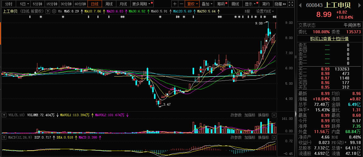 从股价表现上来看,5月22日,上工申贝开盘涨停,收8.99元/股。