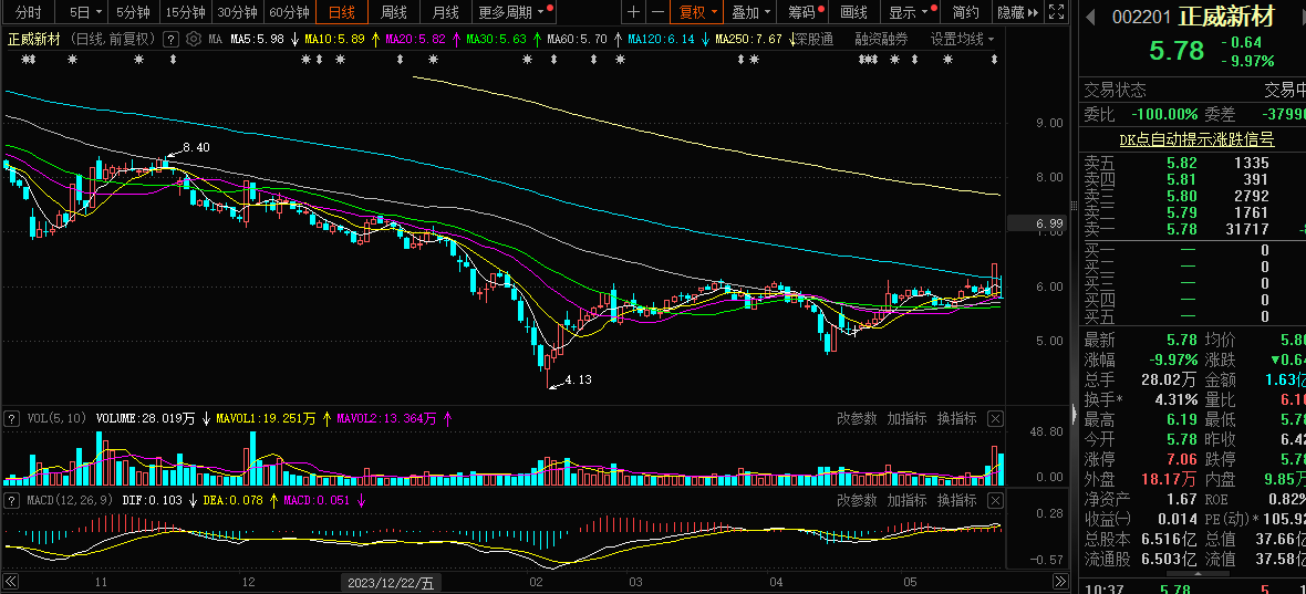 从股价表现上来看,5月27日,正威新材以跌停价开盘,截止发稿,收5.78元/股。