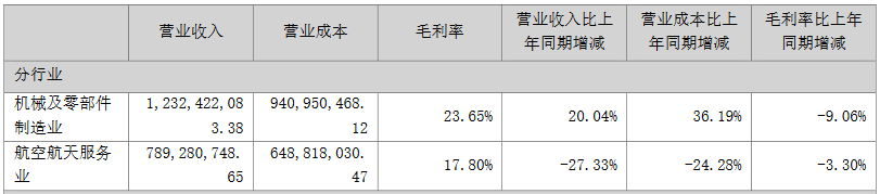 但是,上述业务的毛利率都有所下降。其中,机械及零部件制造业毛利率为23.65%,相比上年同期下降了9.06个百分点;航空航天服务业毛利率为17.80%,相比上年同期下降了3.30个百分点。